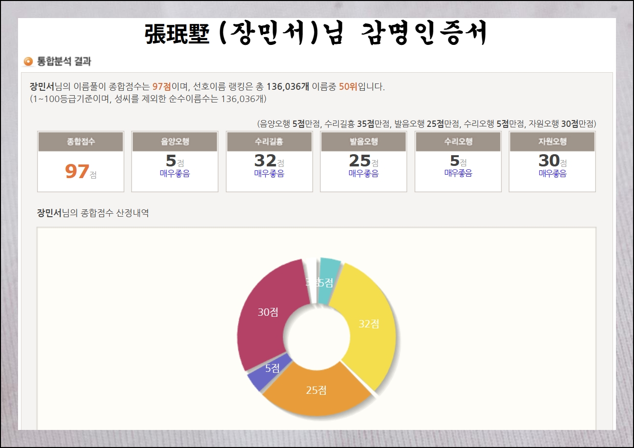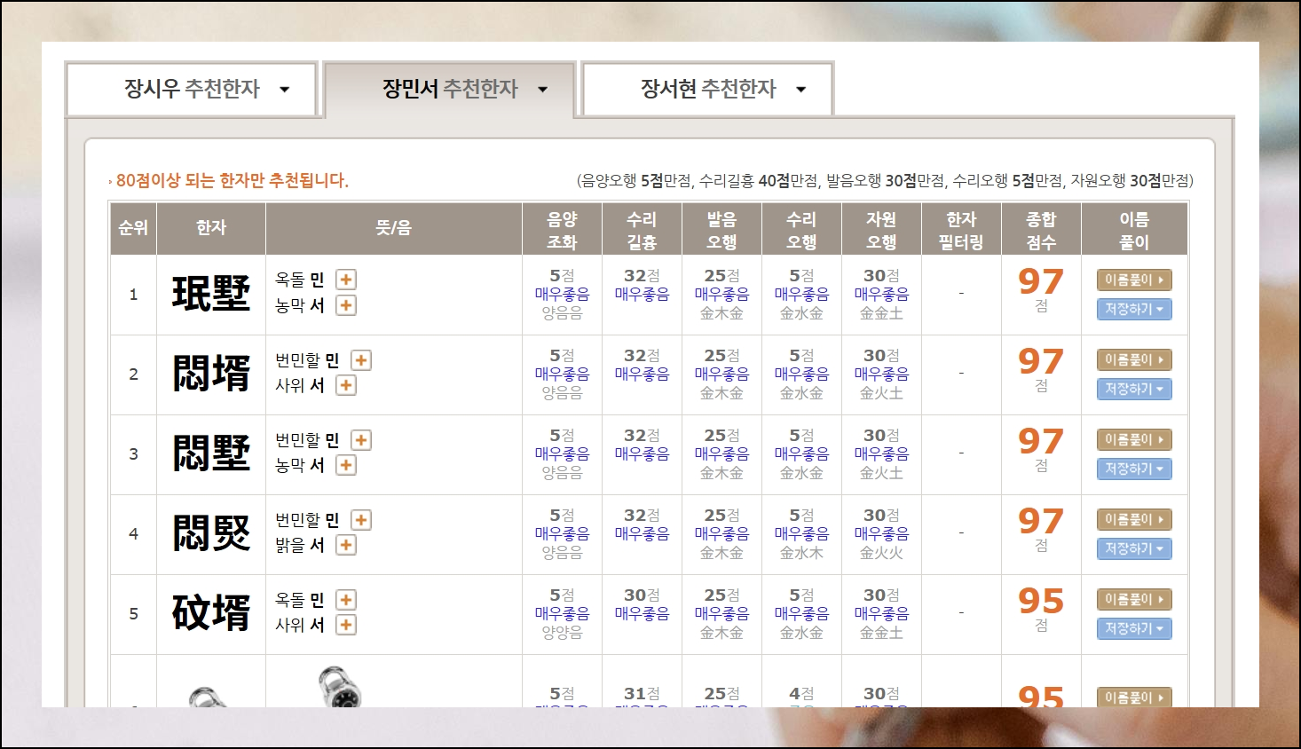 마음에 드는 한자들을 여러 개 발견했어요. 성명학에서는 음양의 균형과 발음오행, 수리오행, 자원오행, 수리길흉을 모두 살펴봅니다. 이런 요소들을 종합해서 높은 점수를 받는 것이 좋다고 할 수 있어요. 무료 서비스만으로도 80점 넘는 우수한 이름과 한자를 쉽게 찾을 수 있습니다.