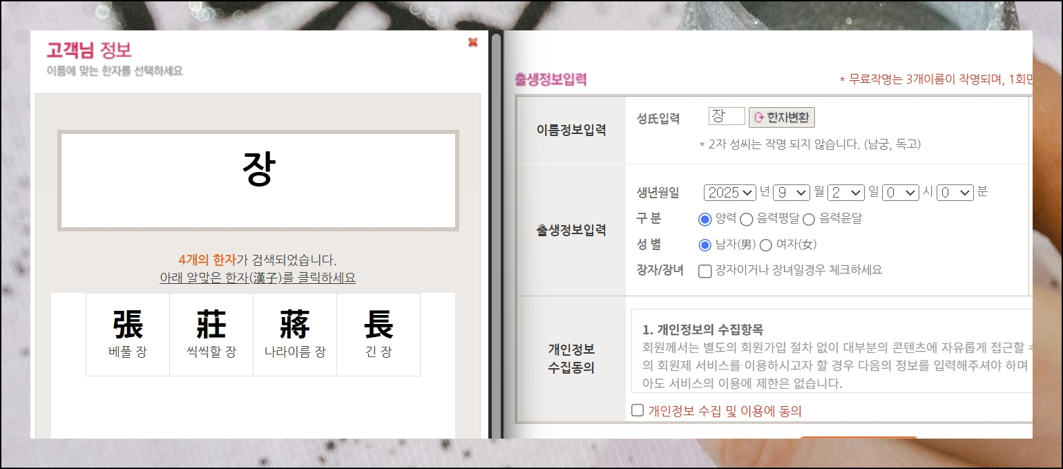 나에게 어울리는 이름과 한자를 찾으려면 기본 정보를 입력해야 해요. 성씨와 성별, 생년월일 정도만 넣으면 됩니다. 입력을 마치면 시작 버튼을 클릭해주세요. 무료 서비스는 이용 횟수에 제한이 있으니 한 번에 제대로 활용하는 게 중요해요.