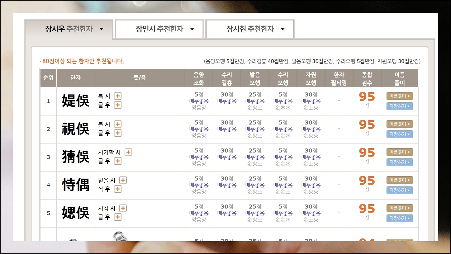 마음에 드는 한자들을 여러 개 발견했어요. 성명학에서는 음양의 균형과 발음오행, 수리오행, 자원오행, 수리길흉을 모두 살펴봅니다. 이런 요소들을 종합해서 높은 점수를 받는 것이 좋다고 할 수 있어요. 무료 서비스만으로도 80점 넘는 우수한 이름과 한자를 쉽게 찾을 수 있습니다.