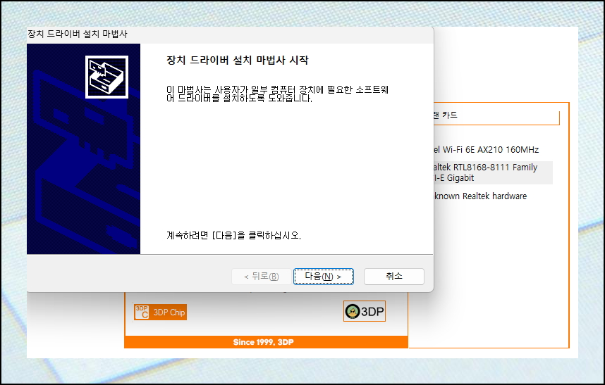 앞에서 설명한 대로 랜카드 이름을 클릭하면 드라이버 설치가 시작돼요. 장치 드라이버 설치 마법사라는 창이 나타나는데요. 화면에 나오는 안내 메시지를 차례로 따라하시면 누구나 쉽게 드라이버를 설치할 수 있습니다.