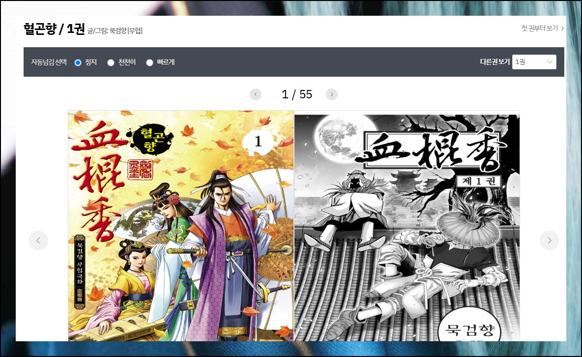 개인적으로 무협물을 선호해서 묵검향 작가의 혈곤향을 골라서 읽어 보았는데요. 뷰어에서는 한 번에 두 페이지씩 깔끔하게 표시되더라고요. 가장 인상적이었던 부분은 자동 페이지 넘김 기능의 존재였어요. 마우스 클릭 없이도 미리 설정한 속도에 따라 자동으로 다음 장면으로 이동합니다. 간식을 먹으면서 콘텐츠를 보기에 최적화된 기능이라고 생각해요.