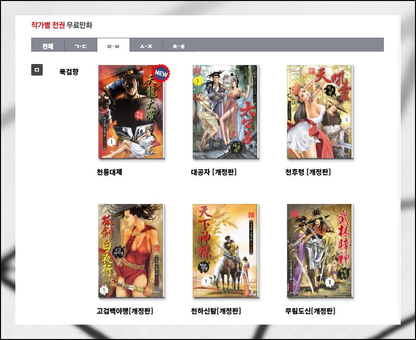 웹사이트의 만화 카테고리로 이동한 후 작가별 전권 무료만화 메뉴를 체크해보세요. 리을부터 비븝까지의 분류에서 선택하면 고검만리후나 유향도수 등 묵검향의 다양한 작품들을 발견할 수 있어요.