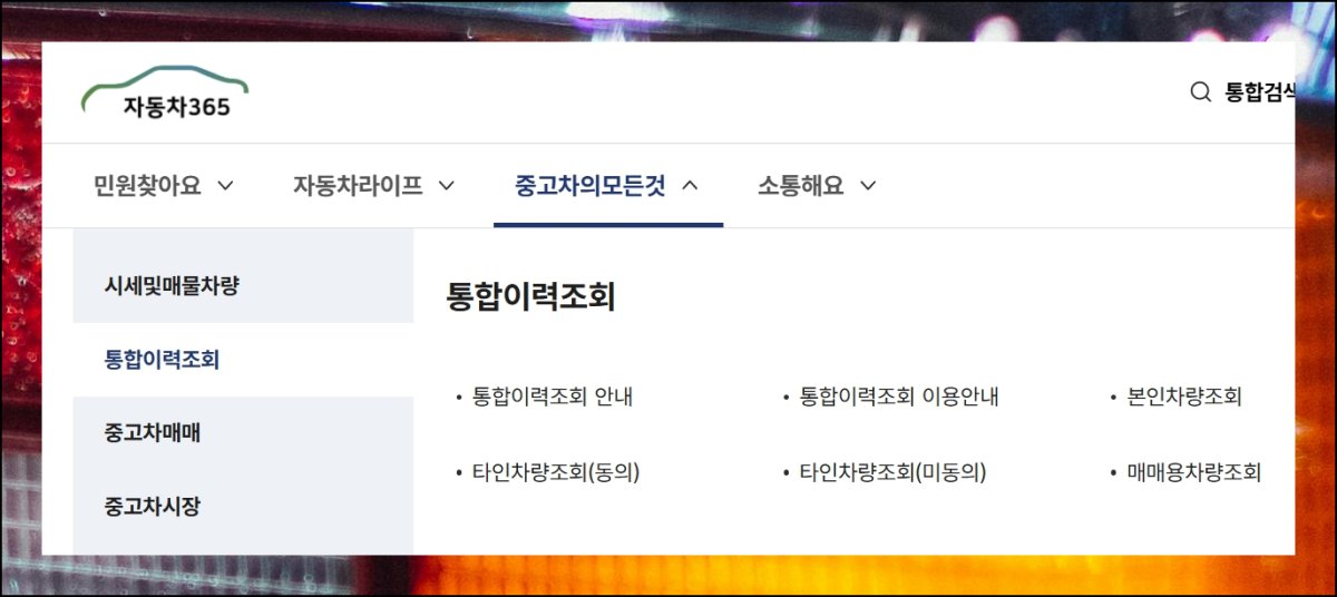"중고차의 모든 것" 메뉴에서 하위 메뉴에 속한 통합이력조회를 선택하세요. 이곳은 중고차 거래에 필요한 가이드와 조회 기능들이 체계적으로 정리된 공간이에요. 번호판을 통한 차량 데이터 확인이 목표라면 이력조회 카테고리에서 적합한 서비스를 골라 이용하면 됩니다. 자동차365 홈페이지를 통해 구매 전 반드시 체크해야 할 핵심 사항들을 손쉽게 파악할 수 있어요.