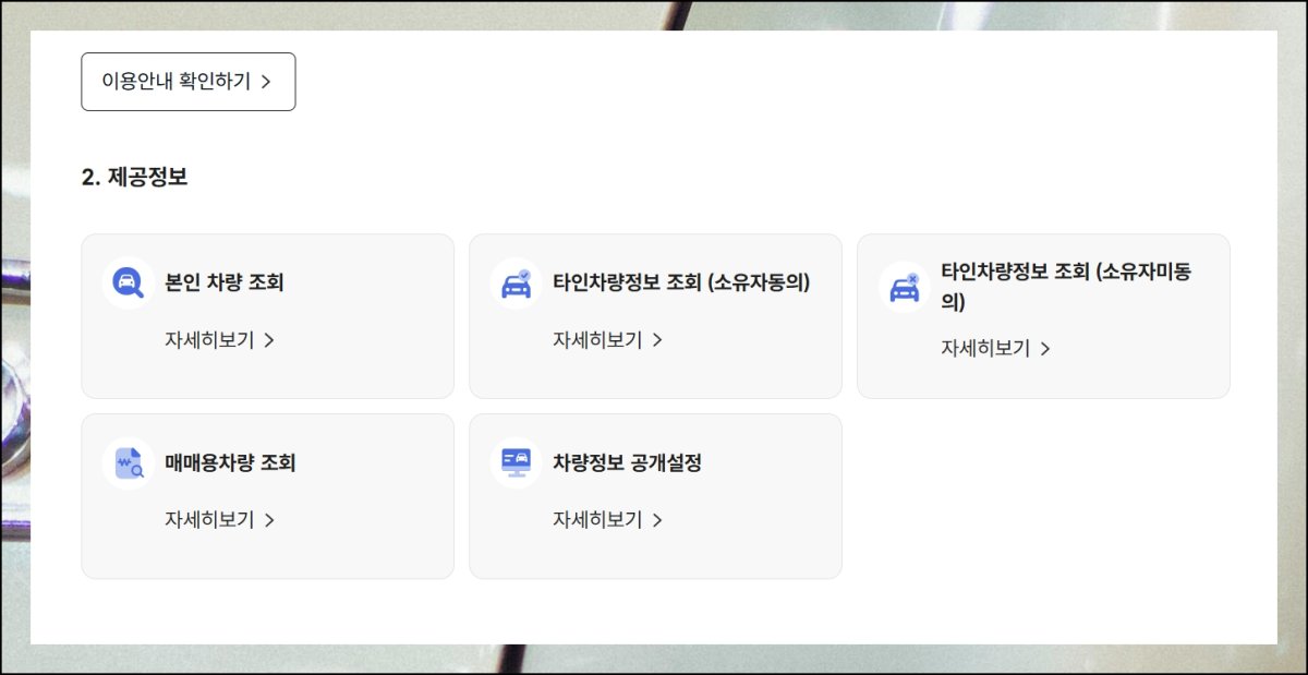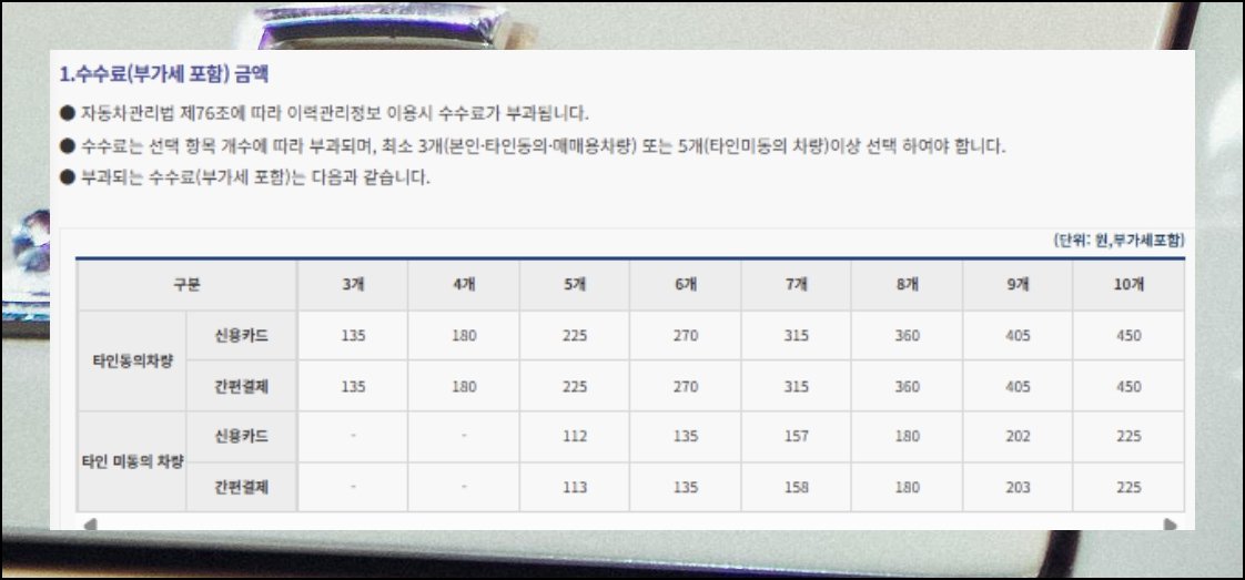 자동차 번호판으로 정보를 조회할 때는 소액의 수수료가 발생해요. 타인 소유 차량의 경우 3건 조회에 135원 정도만 지불하면 됩니다. 조회 건수에 따라 요금이 달라지니 화면에 표시된 안내표를 참고하세요. 몇 백원으로 차량 거래에 중요한 데이터를 확인할 수 있다니 매우 효율적인 투자라고 할 수 있겠어요.