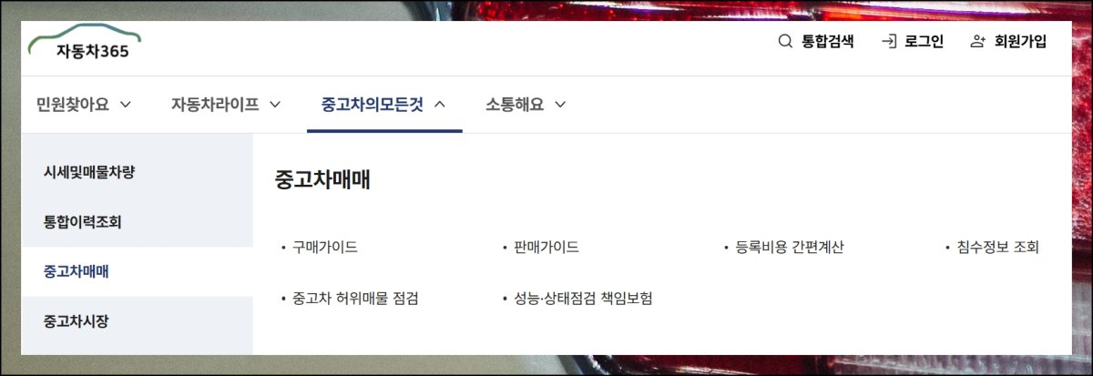 홈페이지의 메인 페이지에 접속하셨다면 중고차 매매 메뉴를 찾아 클릭하세요. 단순히 번호판으로만 데이터를 확인하고 싶다면 통합이력조회도 괜찮습니다. 하지만 실제 중고차 구매가 목적이라면 자동차365 매매 서비스를 선택하는 게 더 유용해요. 여기서는 기본 정보 조회는 물론 매매 관련 다양한 부가 서비스도 함께 이용할 수 있거든요.