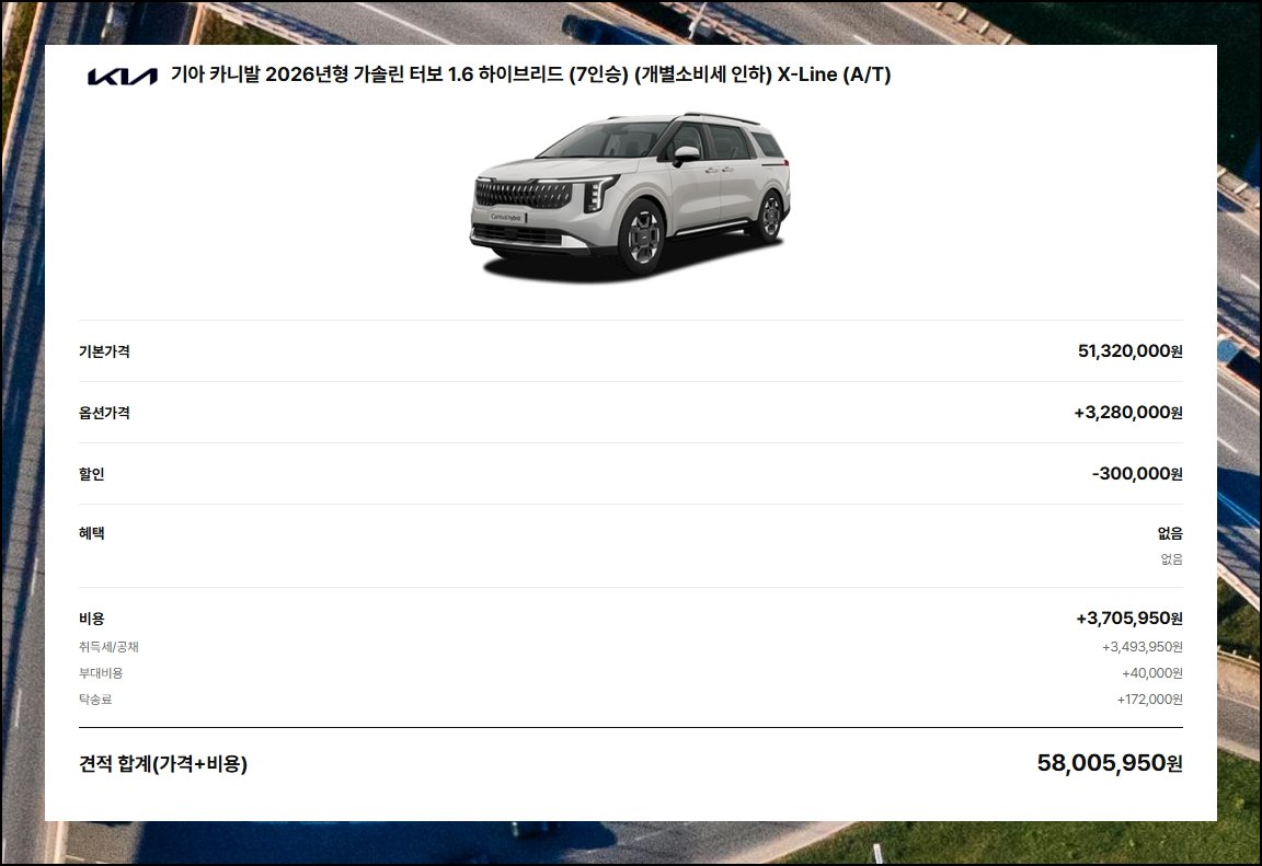 카니발을 새 차로 장만하려면 3천만원대부터 9천만원대까지 다양한 선택지가 있어요. 가족 단위로 이용하기 좋은 9인승 모델은 실용성 때문에 많은 분들이 관심을 갖고 있죠. 탑승 인원과 원하는 기능에 따라 최종 금액이 결정됩니다. 온라인으로 견적을 내보면 몇 번만 클릭해도 내가 원하는 조건의 가격표를 바로 확인할 수 있어요.