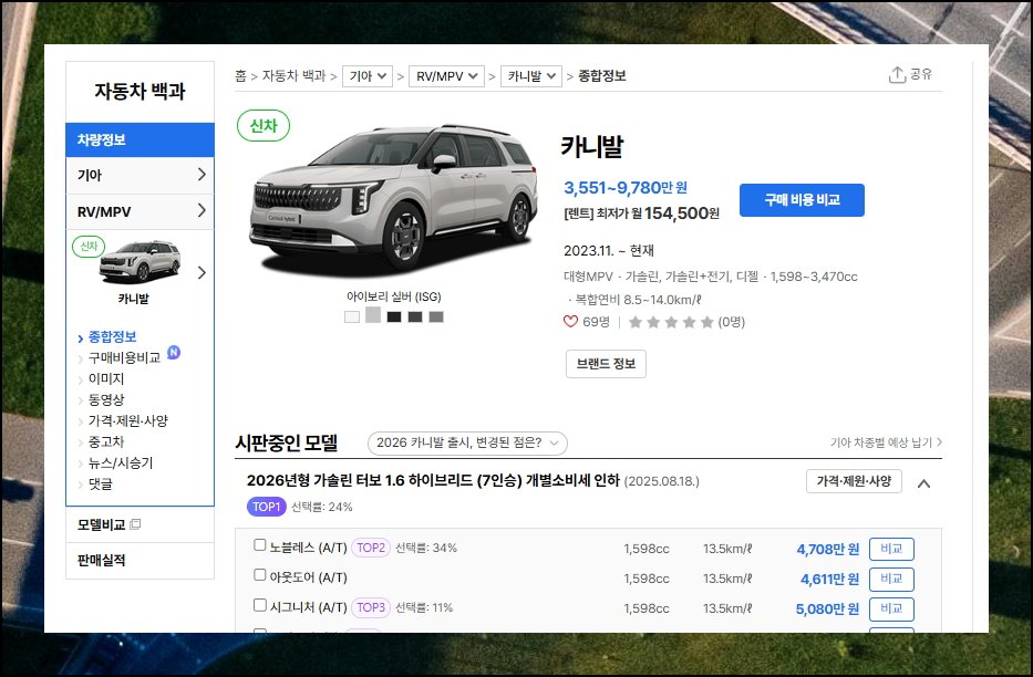 다나와 자동차 사이트를 이용하면 회원가입 없이도 카니발 9인승 정보를 곧바로 살펴볼 수 있어요. 화면 구성이 직관적이라 차량을 잘 모르는 분들도 쉽게 둘러볼 수 있습니다. 웹에서 미리 알아보면 실제 딜러를 만날 때 시간을 아낄 수 있죠.