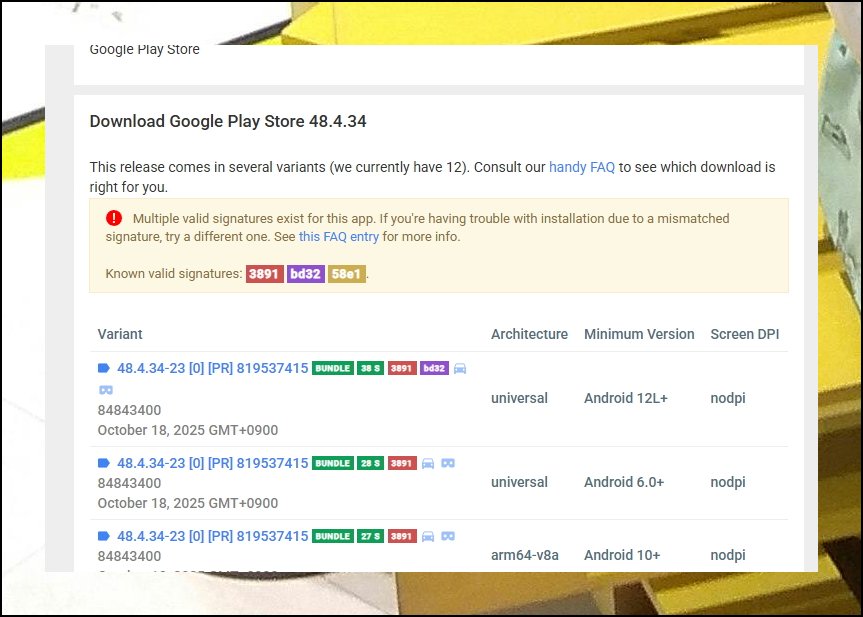 원하는 버전을 클릭하면 다운로드 가능한 여러 옵션이 나타나요. 아키텍처와 최소 안드로이드 사양을 확인해야 합니다. 본인이 사용하는 기기 사양에 맞는 것을 선택하면 돼요.