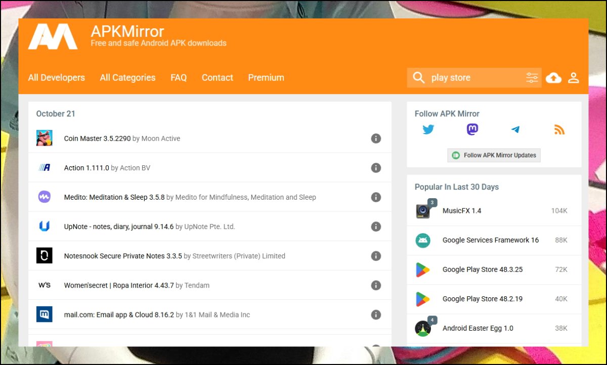 APK 파일을 안전하게 다운로드 받을 수 있는 곳으로 APKMIRROR를 추천해드려요. 이 사이트는 PLAY스토어뿐 아니라 여러 앱에 대하여 설치를 할 수 있도록 도와주는 곳입니다. 메인 화면에 "FREE APK DOWNLOADS"라는 "무료"를 뜻하는 문구가 명확하게 표시되어 있죠.