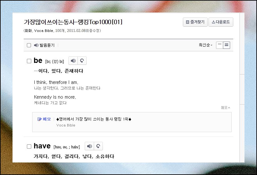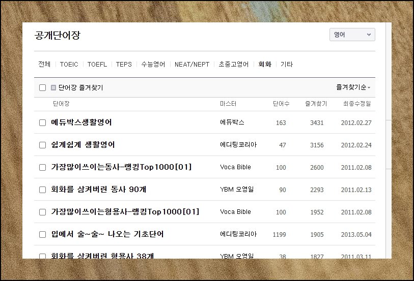 영어 잘하는 것의 핵심은 풍부한 어휘력에 있어요. 회화 향상을 위한 두 번째 추천 사이트는 다음 사전입니다. 유창하게 말하기 위해 엄청나게 많은 단어를 알아야 하는 건 아니에요. 하지만 기본이 되는 핵심 단어들은 확실하게 익혀두어야 합니다. 상단 메뉴의 단어장 섹션을 클릭해보세요. 체계적으로 구성된 도구를 만나실 수 있어요.