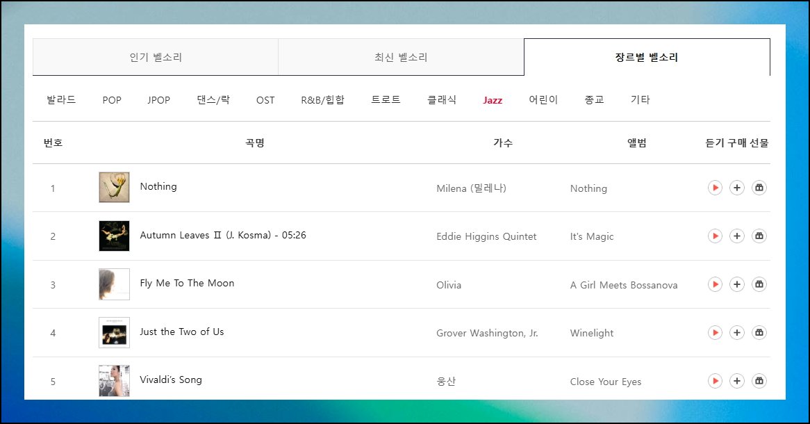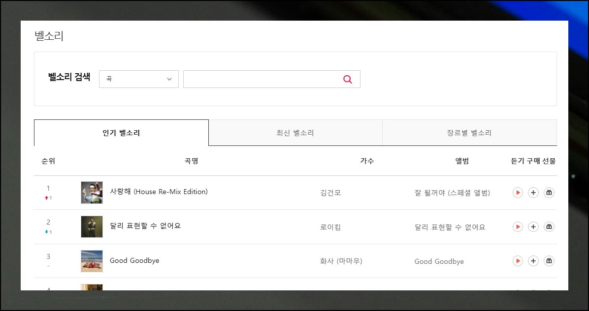 검색 결과로 우리가 원하던 리스트가 화면에 표시돼요. 인기 벨소리 음원을 한눈에 살펴볼 수 있고요. 막 나온 최신곡 정보도 동시에 확인할 수 있어요. 여러 장르로 세분화된 내용을 탐색하는 것도 가능합니다.