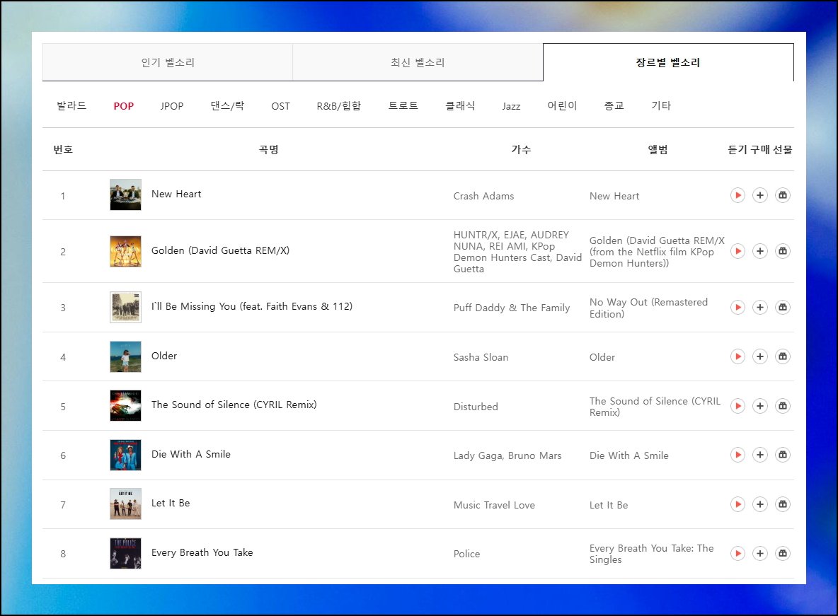오늘 기준으로 사람들이 가장 많이 찾는 팝송 음원 목록을 정리해봤어요. Crash Adams의 "New Heart"로 시작해서 HUNTR/X, EJAE, AUDREY NUNA, REI AMI, KPop Demon Hunters Cast, David Guetta가 참여한 "Golden (David Guetta REM/X)"이 이어지네요. Puff Daddy & The Family의 "I'll Be Missing You (feat. Faith Evans & 112)"와 Sasha Sloan의 "Older"도 플레이리스트에 담겨있고요.