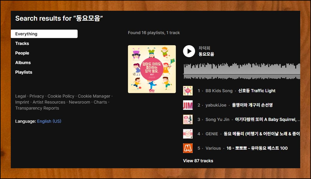 검색하면 무료로 연속듣기가 가능한 콘텐츠가 500개 넘게 화면에 나타나요. 어린이들이 좋아하는 곡으로 구성된 동요모음 플레이리스트가 여러 개 있습니다. 화면 왼쪽에 보이는 TRACKS 메뉴를 클릭해보세요. 그러면 콘텐츠 위주로 깔끔하게 정렬된 결과를 확인할 수 있습니다.