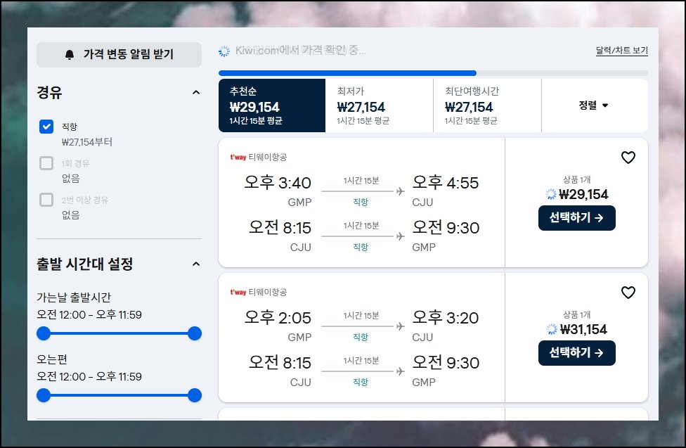 조회한 결과 제주 왕복 저가항공권이 29,154원으로 확인됐어요. 평일 오전 시간대라면 더욱 저렴할 수 있습니다. 이 가격에 만족한다면 선택하기 버튼을 눌러 즉시 예약하면 됩니다. 좀 더 싼 금액을 원한다면 가격 변동 알림 받기 기능을 활용해보세요.