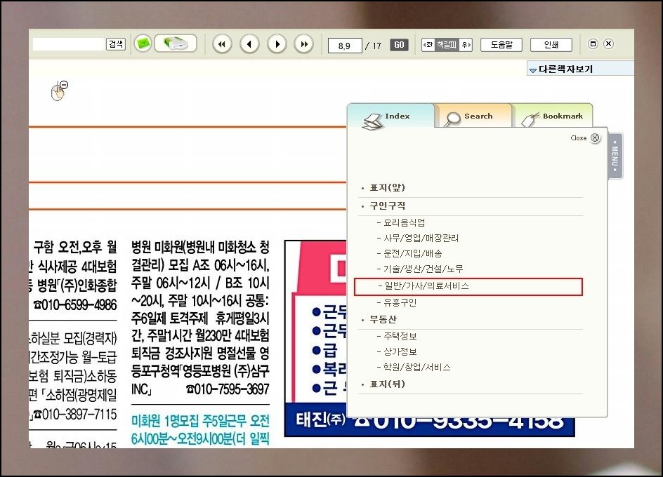 좌측 윗자리에 주제 모음이 배치되어 있습니다. 벼룩시장 채용 공고든 매물 정보든 원하는 영역을 즉각 지정 가능해요. 한 장씩 넘겨가며 뒤질 필요가 없습니다. 신문그대로보기에서 보고 싶은 면으로 단번에 건너뛸 수 있거든요.