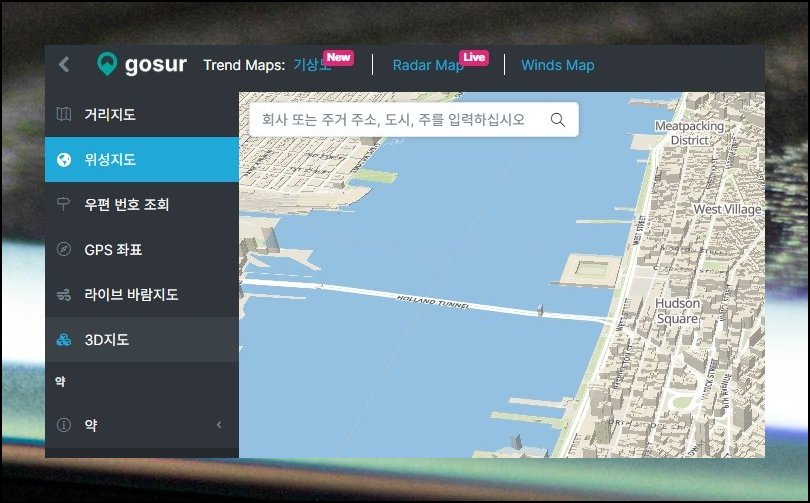 끝으로 보여드릴 곳은 Gosur Maps입니다. 외국 운영 사이트여서 첫 모습은 영문으로 구성돼 있어요. 그렇지만 표시 언어를 바꾸는 설정이 잘 마련돼 있어 국내 이용자도 막힘 없이 위성 지도 보기를 즐길 수 있습니다.