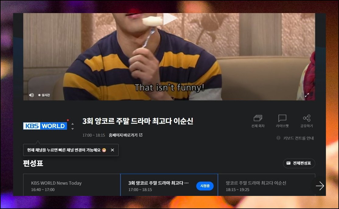 온라인으로 kbs2를 틀면 본 채널 외에 장르별 특화 채널도 함께 열립니다. 화제가 된 영상을 실시간으로 곧장 만나볼 수 있고요. 마음에 들었던 부분은 vod를 통해 원하는 만큼 반복 재생이 가능하니 아쉬울 일이 없어요.