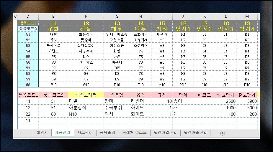엑셀 보호 해제 코드는 1234이니 어렵지 않게 풀 수 있어요. 맨 앞 탭에 프로그램 안내 문서가 들어 있고, 바로 다음 탭에서 품목 등록을 시작하면 됩니다. 코드 체계와 측정 단위를 매장 환경에 맞게 고쳐주세요. 이후 물건 정보를 차근차근 넣어가면 재고관리 기본 세팅은 마무리돼요.