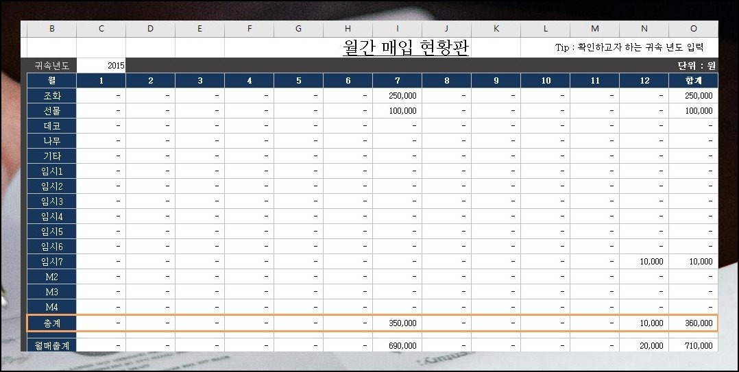 매입과 매출 변화를 살펴볼 수 있는 독립 탭이 엑셀 프로그램 안에 마련되어 있어요. 수치 테이블과 시각 차트가 나란히 배치되어 경영 현황을 곧바로 읽어낼 수 있습니다. 앞선 탭에서 쌓아둔 재고관리 내용이 자동 연동되므로 추가 작업이 필요 없어요. 기록이 누적될수록 추세가 훨씬 뚜렷하게 드러납니다.