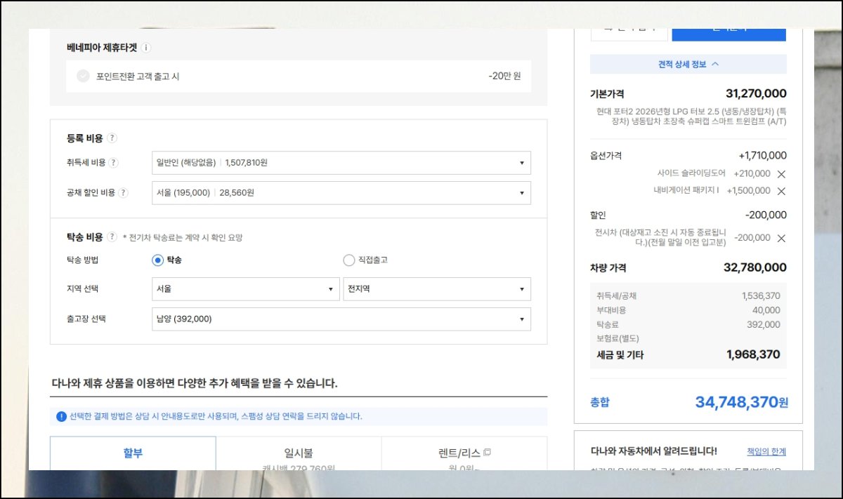등록세나 채권 부담금, 탁송비 등 부수적 지출은 프로그램이 자체 산정해줘요. 기본 정보만 넣으면 현대자동차 1톤트럭 신차의 최종 납부액이 곧바로 표시됩니다.