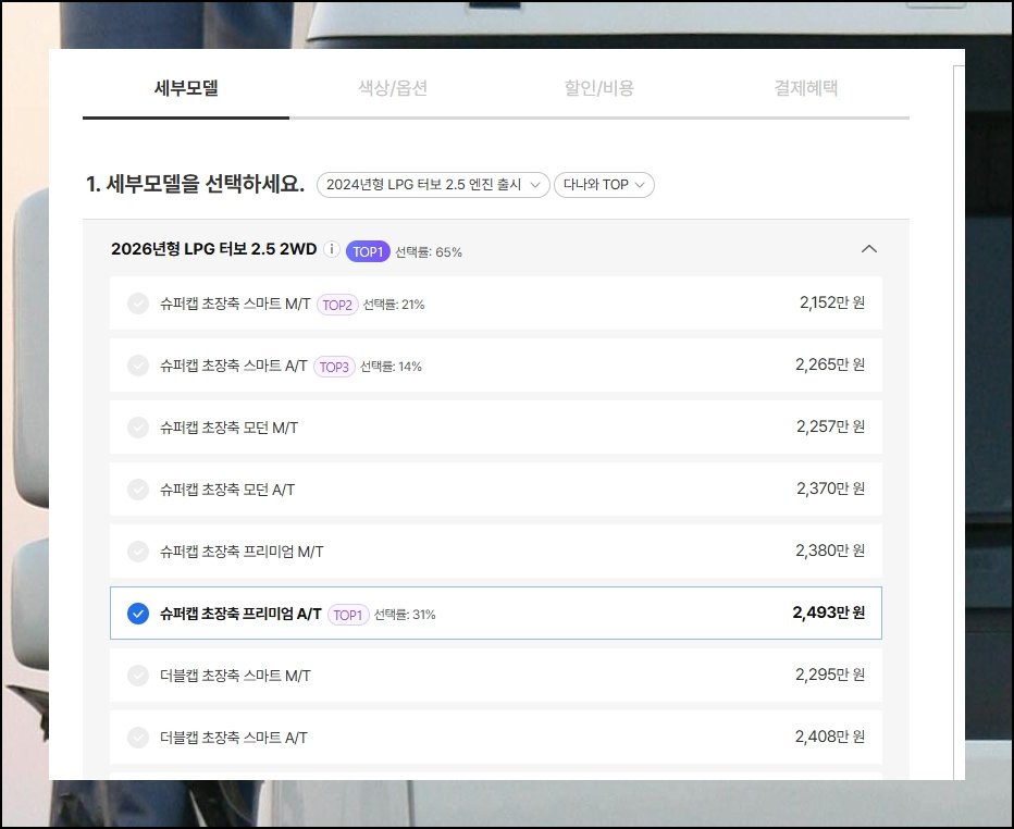 산출 과정은 세부 모델, 부가 장비, 감면 적용, 납부 수단의 네 구간으로 구성돼요. 맨 첫 구간에서 1톤트럭의 굴림 방식이나 동력 종류 같은 세부 규격을 잡아주세요. 선택지가 헷갈린다면 인기 딱지가 붙은 항목을 기준 삼아도 무방합니다.