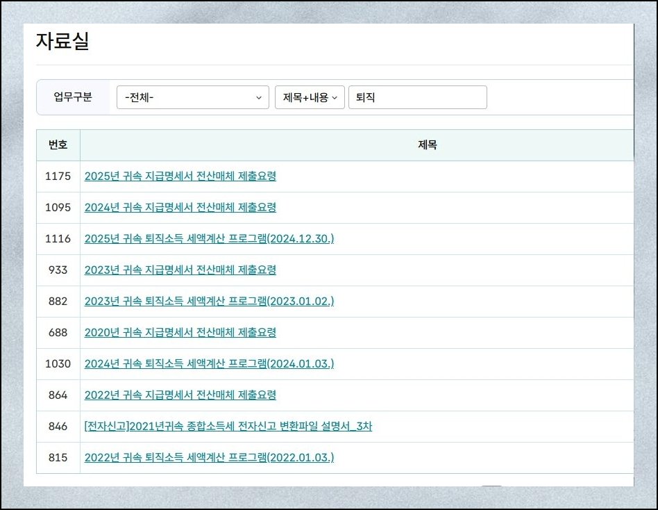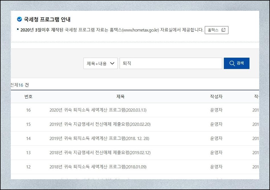 검색란에 퇴직소득세라고 입력하면 됩니다. 화면에 연관 파일 여러 건이 펼쳐질 거예요. 제목이 겹치는 항목이 있다면 등록 일자를 반드시 살펴보세요. 가장 나중에 게시된 걸 택하면 실수가 없습니다. 2020년 3월 뒤쪽 자료는 홈택스 경로로 넘어가야 받을 수 있어요. 윗부분에 홈택스 자료실 연결 버튼이 배치되어 있으니 참고하세요.