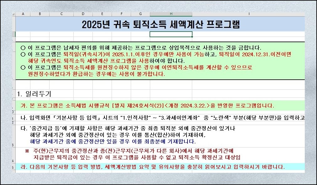해당 자료는 2025년 새해 첫날 이후에 회사를 떠난 분이 이용할 수 있는데요. 그보다 앞서 퇴사했다면 퇴직 시점에 맞는 다른 판본을 구해야 합니다. 엑셀 기반이라서 오피스 설치 상태를 미리 점검해 두세요. 복잡한 계산방법을 암기할 필요는 전혀 없어요. 인근 게시글에서도 퇴직소득세 관련 보충 자료를 충분히 얻을 수 있습니다.