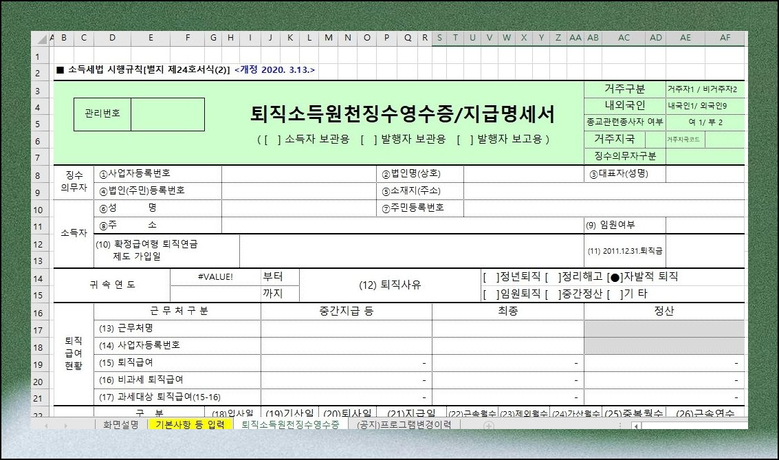 파일을 실행하면 색깔별로 구획이 나뉜 작성 공간이 펼쳐집니다. 노란 배경이 깔린 셀에 본인 정보를 차례로 기입해 주세요. 입사일과 퇴사일이 첫 번째 필수 항목이에요. 보수 지급 사항 역시 빼놓지 말고 적어야 합니다. 퇴직소득세 계산방법에 익숙하지 않아도 초보자용 길잡이 문구가 딸려 있으니 그대로 따라가면 막힘 없이 마무리됩니다.