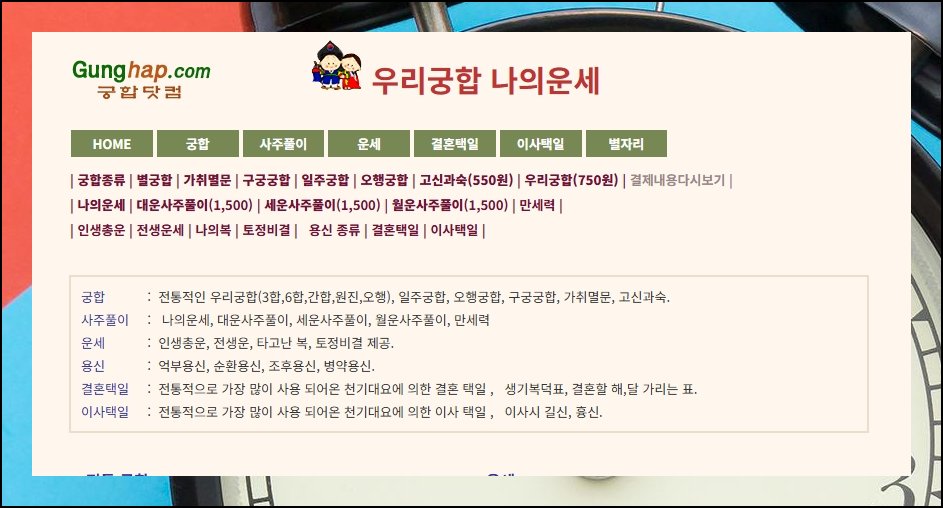 요즘 비용 없이 접속할 수 있는 운명 풀이 사이트가 눈에 띄게 많아졌어요. 명식, 십신, 대운, 세운, 오행 같은 주요 항목을 무료로 손쉽게 조회할 수 있습니다. 보통은 10년 주기 대운과 1년 주기 연운 정도만 공개하는 편인데요. 오늘 소개할 궁합닷컴은 월운과 일운까지 무료로 펼쳐 줘서 쓰임새가 제법 넓어요.