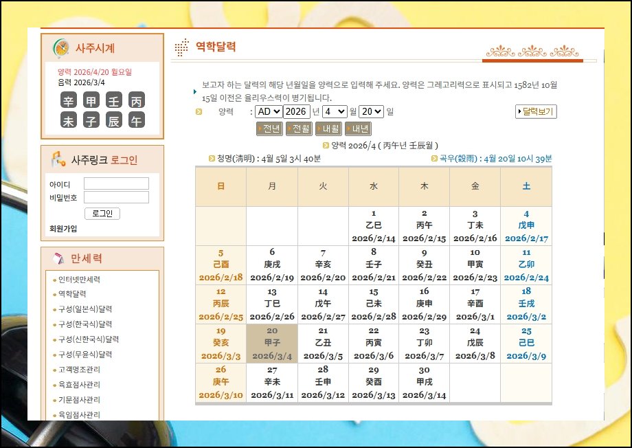 만세력 외에 역학 캘린더 플랫폼도 함께 이용하세요. 사주링크에서 운영하는 페이지 역시 무료로 다양한 운세 콘텐츠를 훑어볼 자리를 마련해 줍니다. 앞서 소개한 궁합닷컴과 나란히 돌려 보면 한결 풍부한 자료가 손에 들어와요.