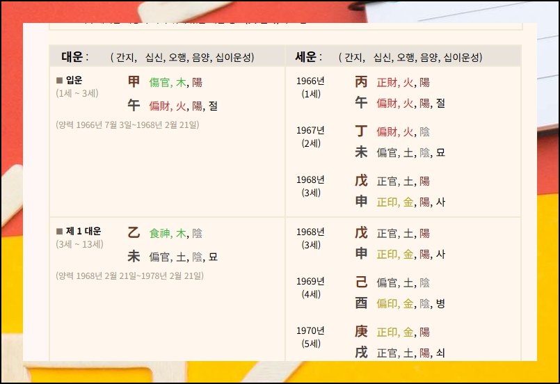 다음은 캘린더 방식으로 짜여진 만세력 해석을 살펴볼 차례예요. 열 해 간격 대운을 축으로, 해마다 바뀌는 세운을 따라 간지, 십신, 오행이 차례로 나열됩니다. 한자로 쓰여 있어 시각적으로 까다로울 수 있지만 몸소 해석해야 해요. 생소한 글자는 하나씩 검색하면 뜻을 어렵지 않게 파악할 수 있습니다.