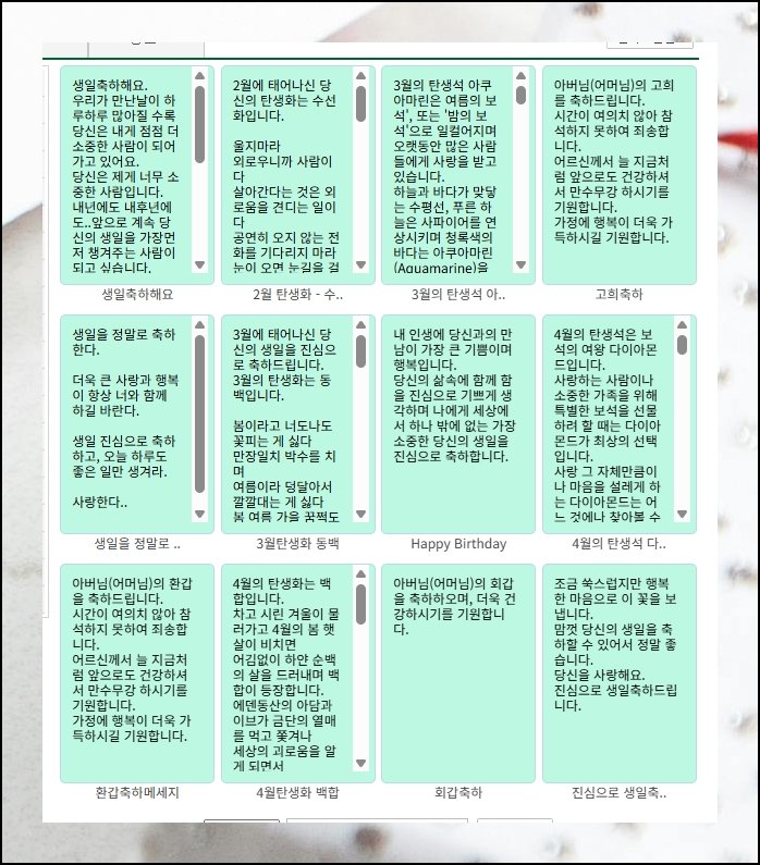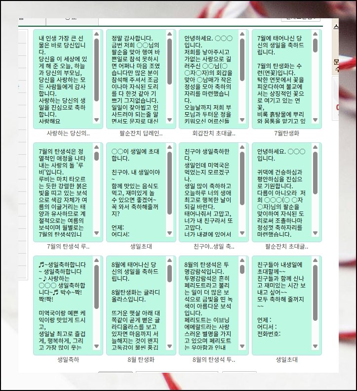 왼쪽 패널 쪽에는 상황별로 세세하게 분류된 탭이 단정하게 줄지어 놓여 있어요. 거기서 생일축하 탭을 지긋이 눌러 주면, 촘촘하게 엮어 둔 메세지 묶음이 그 자리에서 곧장 쭉 펼쳐집니다. 옆에 나란히 떠 있는 귀여운 일러스트도 놓치지 말고 같이 곁들여 보세요. 그림 조각 하나가 슬그머니 끼어드는 것만으로도 전체 분위기가 한결 따스하고 환한 풍경으로 은근하게 달라져요.