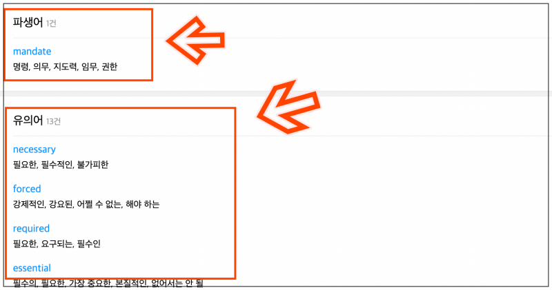 이렇게 파생어나 유의어를 알아볼 수도 있어요.