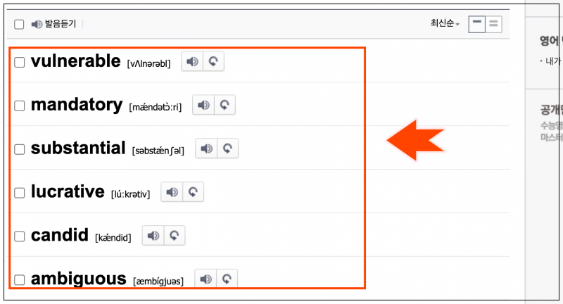 단어장을 마우스로 클릭해보세요. 그럼 해당 단어에 관한 뜻, 예문, 참고 사항 등을 확인할 수 있어요. 여기에 더하여 발음 듣기도 가능한데요. 스피커 모양의 아이콘을 클릭하면 들을 수 있어요.