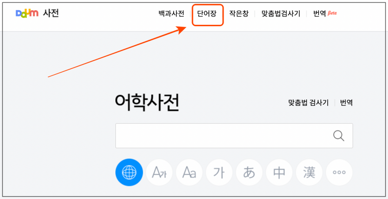 다음 사전 사이트에 접속했어요. 한영, 영영, 중국어, 한자 사전 등을 선택할 수 있게 되어 있는데요. 1000개 이상으로 구성된 영어 단어 리스트를 얻길 원한다면 사이트 최상단에 있는 "단어장"을 클릭해 주세요.