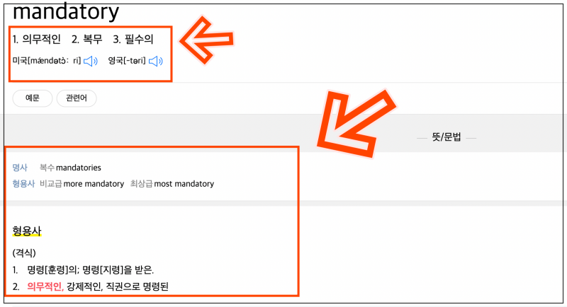 뜻이나 문법을 상세하게 알아보거나 익히고 싶을 때에는 마우스로 해당 단어를 클릭해 보세요. 그럼 이렇게 다음의 사전 정보를 바로 확인할 수 있어요. 여러 가지 뜻은 물론이고, 문법 관련 정보도 확인이 가능해요.