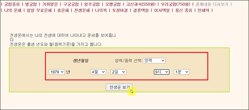 이곳에서 제공하는 전생 서비스를 이용하기 위해서는 몇 가지 정보를 필히 입력해야 해요. 이곳은 출생년도와 태어난 시각을 이용하여 보는법을 사용하고 있는데요. 여기서 양력인지 또는 음력인지 제대로 선택하셔야 해요. 선택을 잘못하면 제대로 된 결과를 얻을 수 없기 때문이에요.