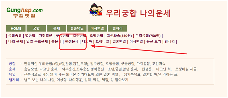 제가 이용한 전생 보는법은 궁합닷컴에서 제공하는 서비스에요. "우리 궁합 나의 운세 사이트"라고도 불리는 곳인데요. 이곳에서는 궁합, 운세, 결혼 택일 등 이용할만한 역술 서비스가 많아요. 대부분 무료로 이용할 수 있기 때문에 부담이 없어요.
