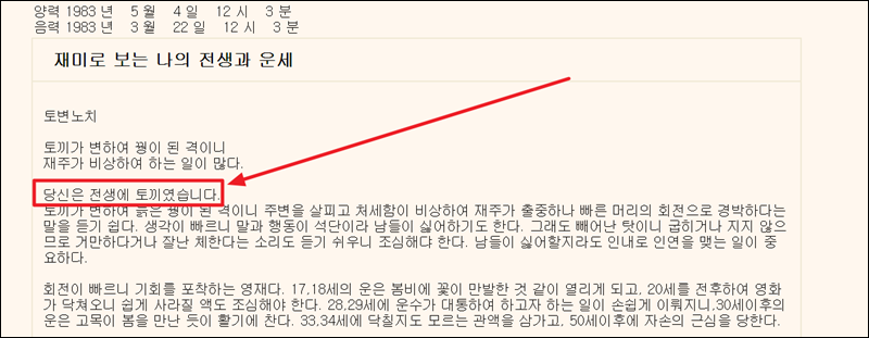 재미로 보는 나의 전생과 운세 서비스를 이용해 본 결과에요. 전생에 토끼였다고 하네요. 토끼의 경우 재주가 많고, 머리 회전이 빠르다고 해요. 전생에 토끼였기 때문에 지금도 그 기질을 이어 받았다고 하는데요. 나이에 따라 어떤 운이 들어오는지 알려주기도 하네요. 보는법은 간단한데요. 하나씩 따라 해보세요.