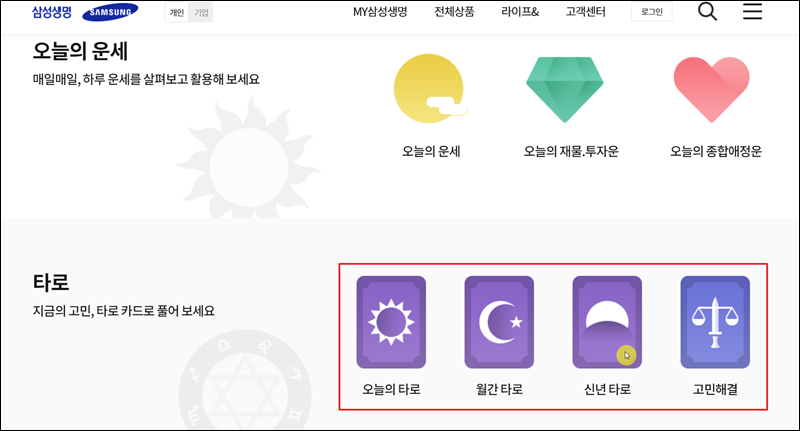 높은 퀄리티의 타로점 서비스를 이용해 보도록 할게요. 품질이 높은 것에 반해 이용료가 전혀 없기 때문에 정말 좋아요. 삼성생명 홈페이지에 접속하면 이용할 수 있는데요. 어떻게 이용하는지 알려드릴게요.
