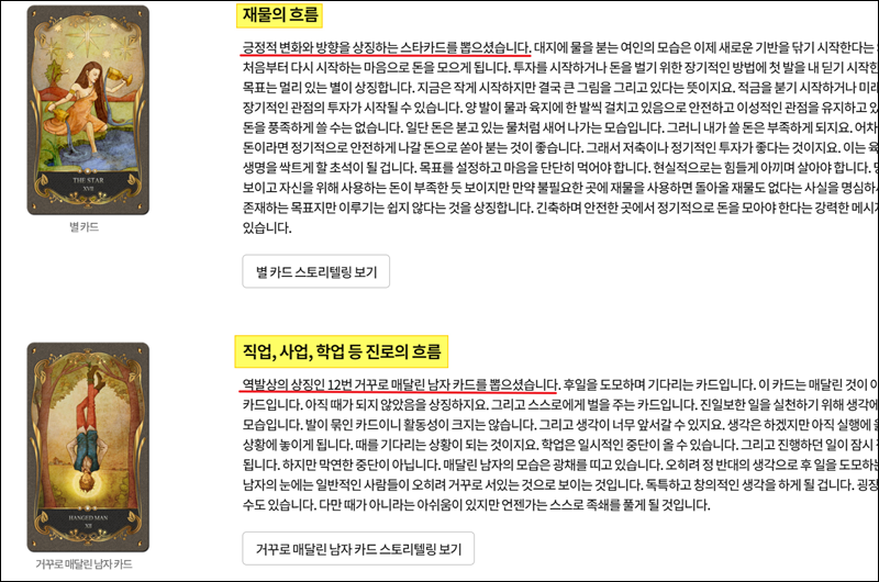 카드를 모두 선택한 상태에서 "결과보기" 버튼을 클릭해 보세요. 그럼 상세한 타로점 결과가 나타나는데요. 직접 해본 경험에 의하면 꽤 정확도가 높아요.