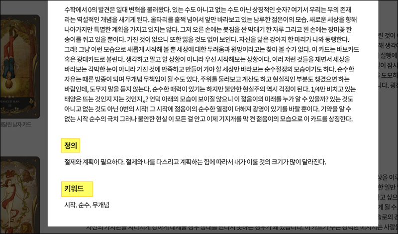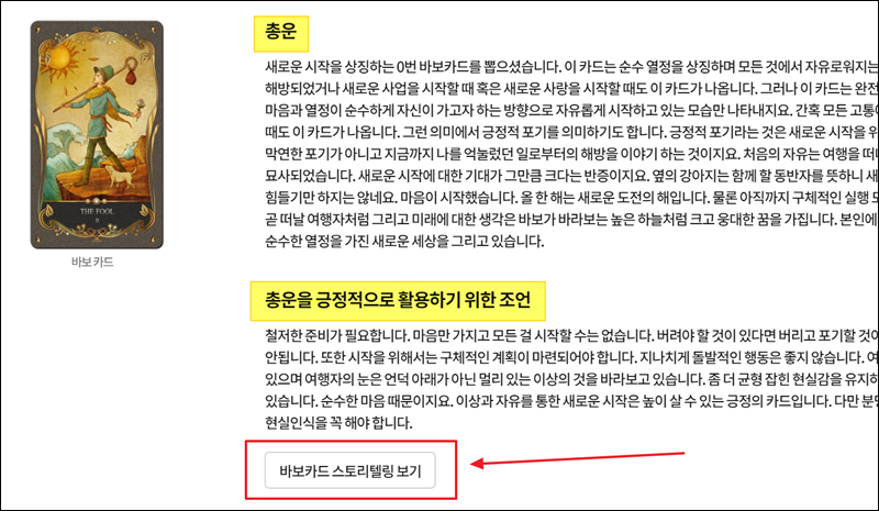 타로점에 대해 더 알고 싶거나 공부하고 싶은 분들은 "스토리텔링 보기" 버튼을 클릭해 보세요. 그럼 이렇게 우리가 뽑은 타로카드에 대한 정의, 키워드, 설명을 확인할 수 있어요.
