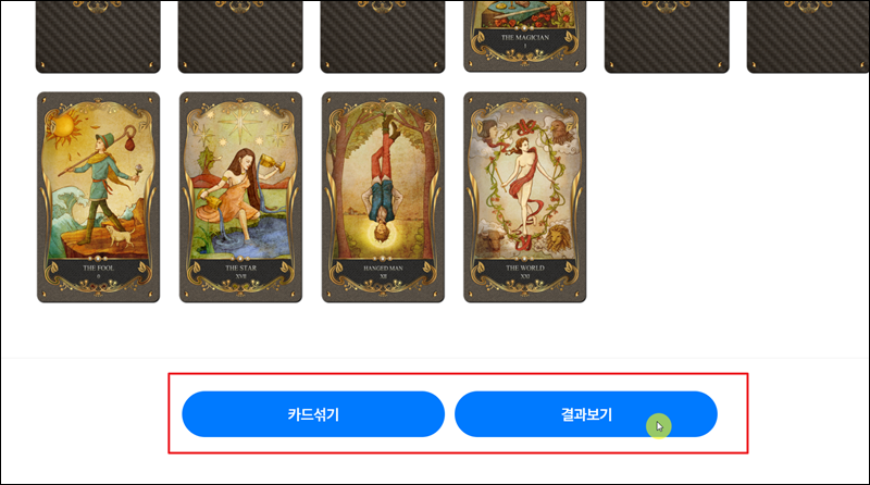 마우스 클릭을 잘못해서 뽑고자 하는 카드가 아닌 다른 카드를 선택할 때가 있는데요. 이런 경우에는 "카드섞기" 버튼을 누르면 다시 처음부터 진행이 가능해요.