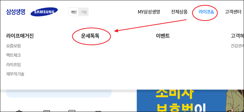 사이트에 접속하면 우측 상단에 여러 가지 메뉴가 있어요. 여기에서 "라이프&"을 클릭해 보세요. 그럼 사이트 방문자들에게 유용한 여러 가지 온라인 서비스가 나타나요. 여기에서 "운세톡톡"을 클릭하면 돼요.