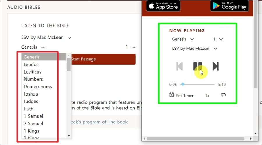 챕터 선택도 가능한데요. 창세기, 출애굽기, 레위기, 민수기 등 듣기 원하는 부분을 선택해주면 됩니다.
