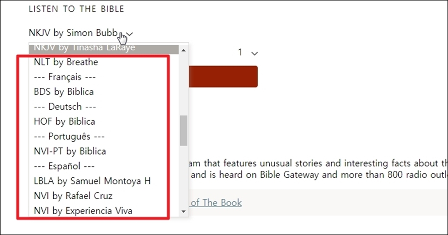 영어 외에도 프랑스어, 독일어, 포르투갈어, 스페인어 등으로 씌여진 성경을 보거나 듣기 가능합니다.