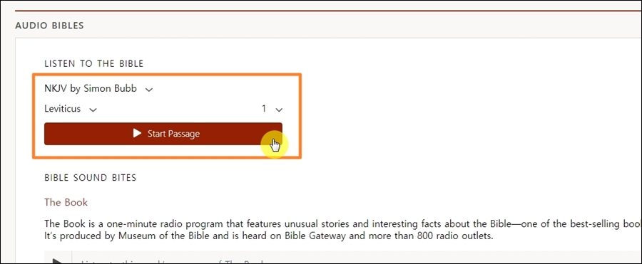 새롭게 열린 페이지에서 Start Passage 버튼을 누르면 성경을 읽어주는 서비스가 재생됩니다.