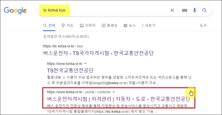 버스운전자격시험 수험용 자료집을 얻기 위해서는 한국교통안전공단의 버스운전자격시험 사이트로 접속해야 합니다. 제가 접속하는 방식과 같이 "lic kotsa bus"로 검색한 후 3번째 위치한 링크를 클릭해 주세요.