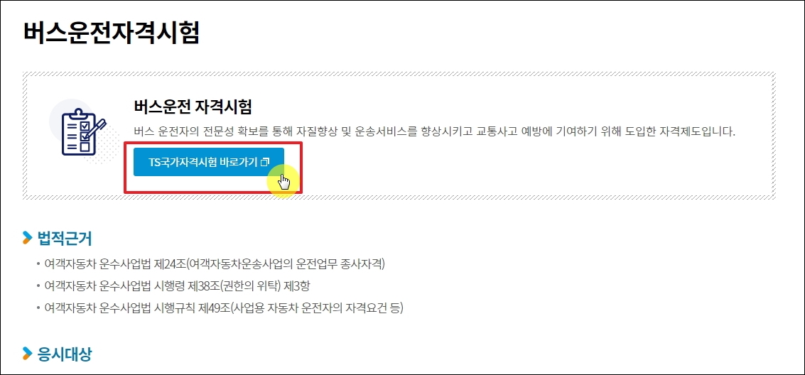 접속한 페이지를 보면 버스운전자격시험에 관한 여러 가지 안내 사항이 나와 있습니다. 시험을 치루기 이전에 한 번 보면 도움이 될 만한 내용입니다. 그럼 수험용 자료집을 얻기 위해 "TS국가자격시험 바로가기"를 클릭해 주세요.