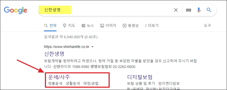 ▼인터넷 세상에는 이용할 수 있는 사주팔자 서비스가 꽤 많이 있습니다. 그 중에서 가장 퀄리티가 높고, 무료로 사용할 수 있는 곳을 찾아보았습니다. 바로 신한생명에서 제공하는 [운세/사주] 서비스입니다. 구글을 이용하면 메뉴 선택 없이 바로 해당 서비스로 접속이 가능합니다.